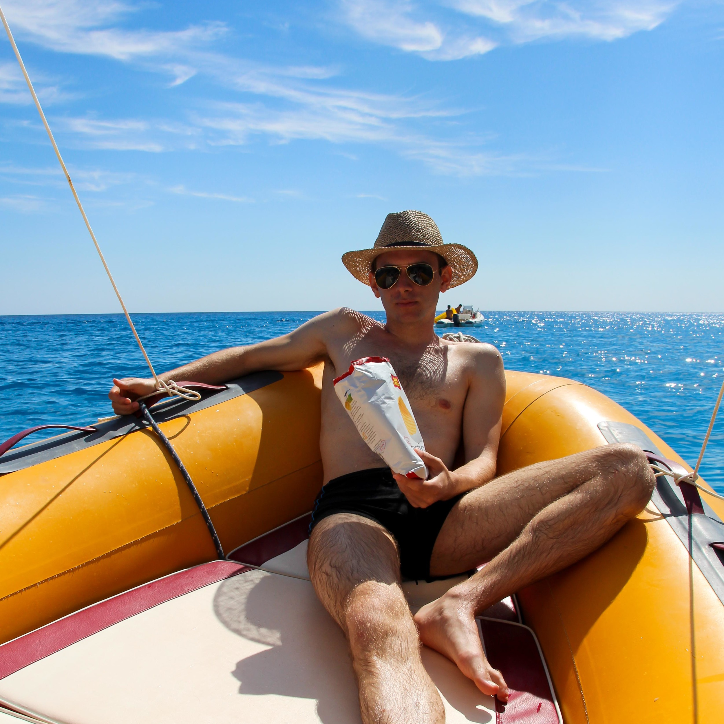 Kristian in his happy place...with a bag of chips, on a boat in the Mediterranean sea.